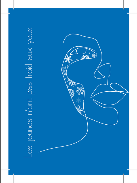 Nous avons choisi un style épuré et moderne. Le visage sans genre et tracé en une ligne nous montre la modernité et le fait que chaque personnes peut s’identifier à lui. Et pour apporter la touche de froid nous avons décidé d’ajouter des flocon et de choisir un bleu Pantone qui à était élu couleur de l’année 2020.