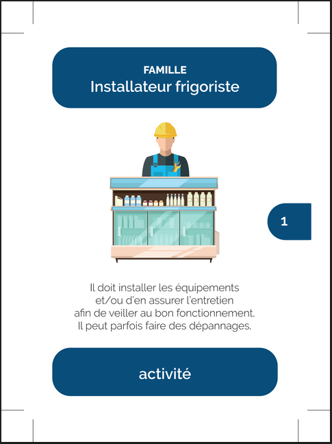 Ensuite, nous avons réalisé un jeu des 7 familles en tant que print complexe. Chaque famille représente un métier de la branche du froid. Et en catégorie nous retrouvons : L’activité, les compétences, la formation, les secteurs, le matériel ou l’équipement, évolution de carrière.